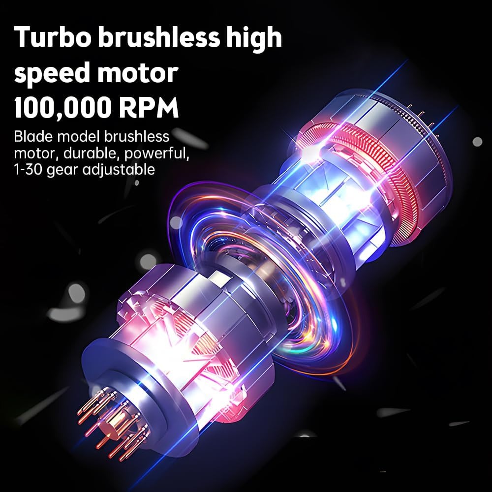 - أداء قوي: محرك توربيني بدون فرشات بسرعة تصل إلى 100,000 دورة في الدقيقة مع 30 مستوى قابل لتعديل سرعة الرياح.