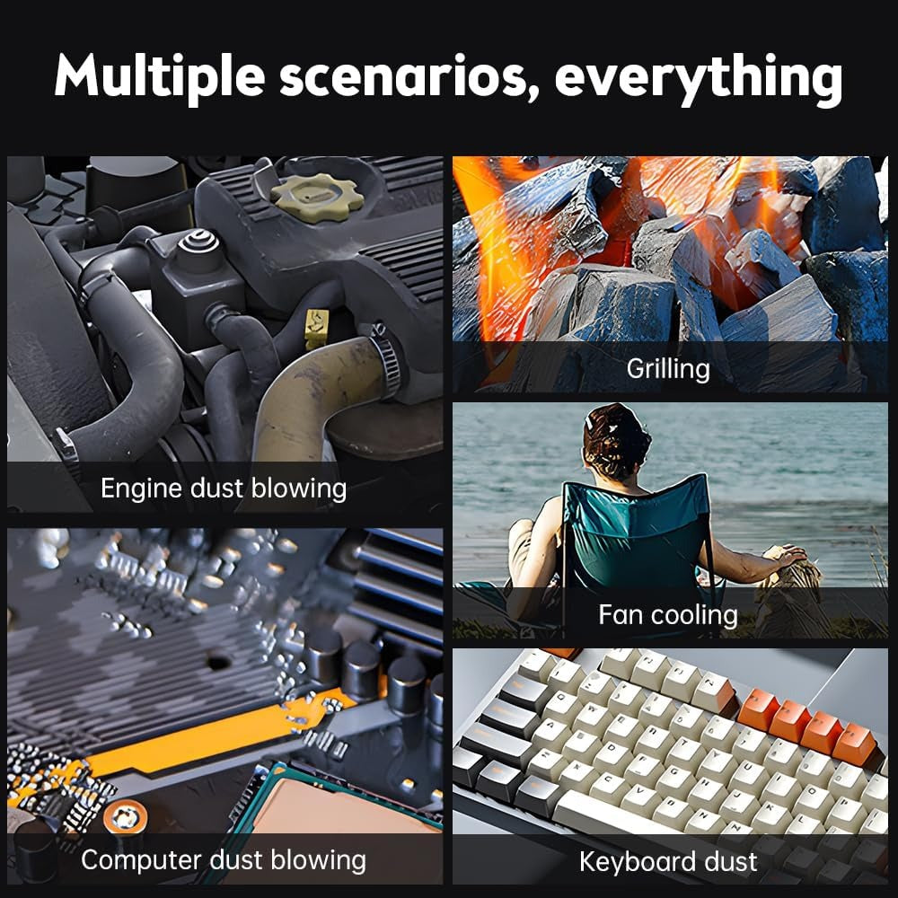 - استخدامات متعددة: مثالي لتنظيف السيارات، أجهزة الكمبيوتر، المنازل، إزالة الغبار الصناعي، نفخ الوسائد الهوائية، ودعم الحريق الخارجي.